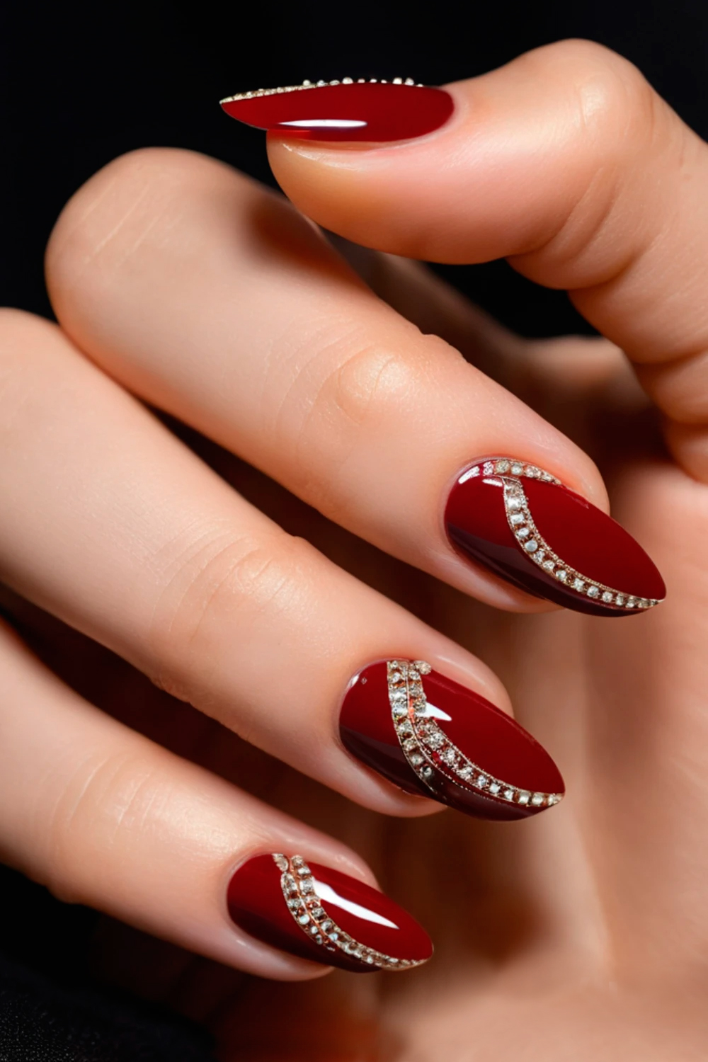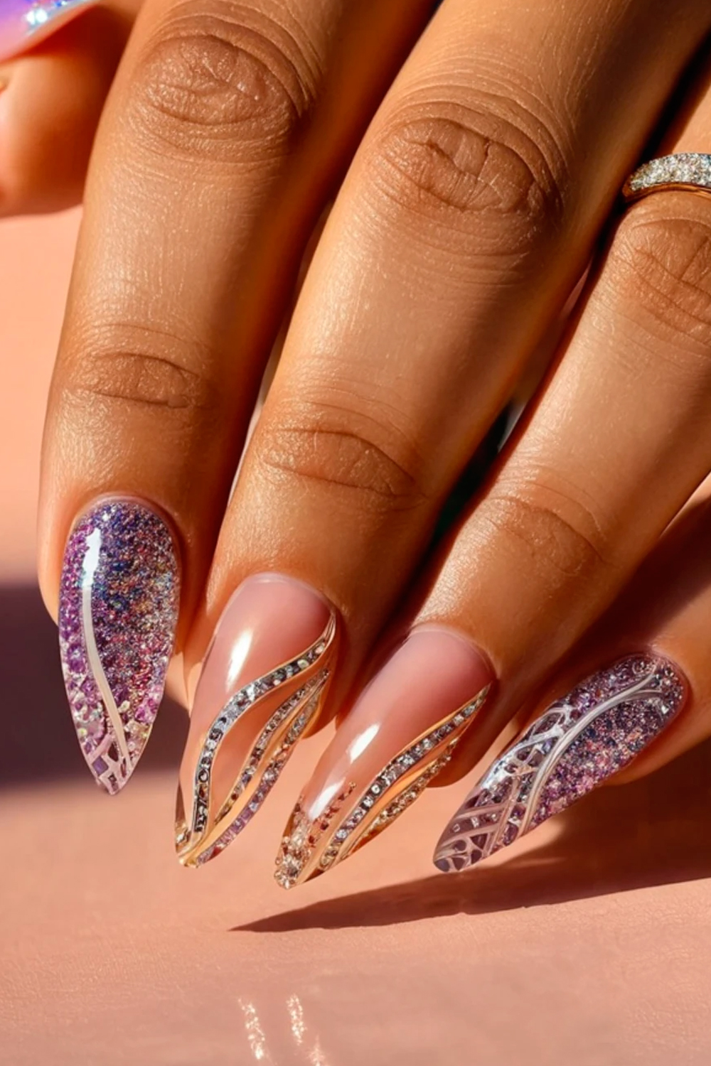- Linhas curvas com pedras ou glitter sempre dão mais beleza a suas unhas. Uma alternativa simples pode ser desenhar linhas com pincéis finos ou usar fitas metálicas.