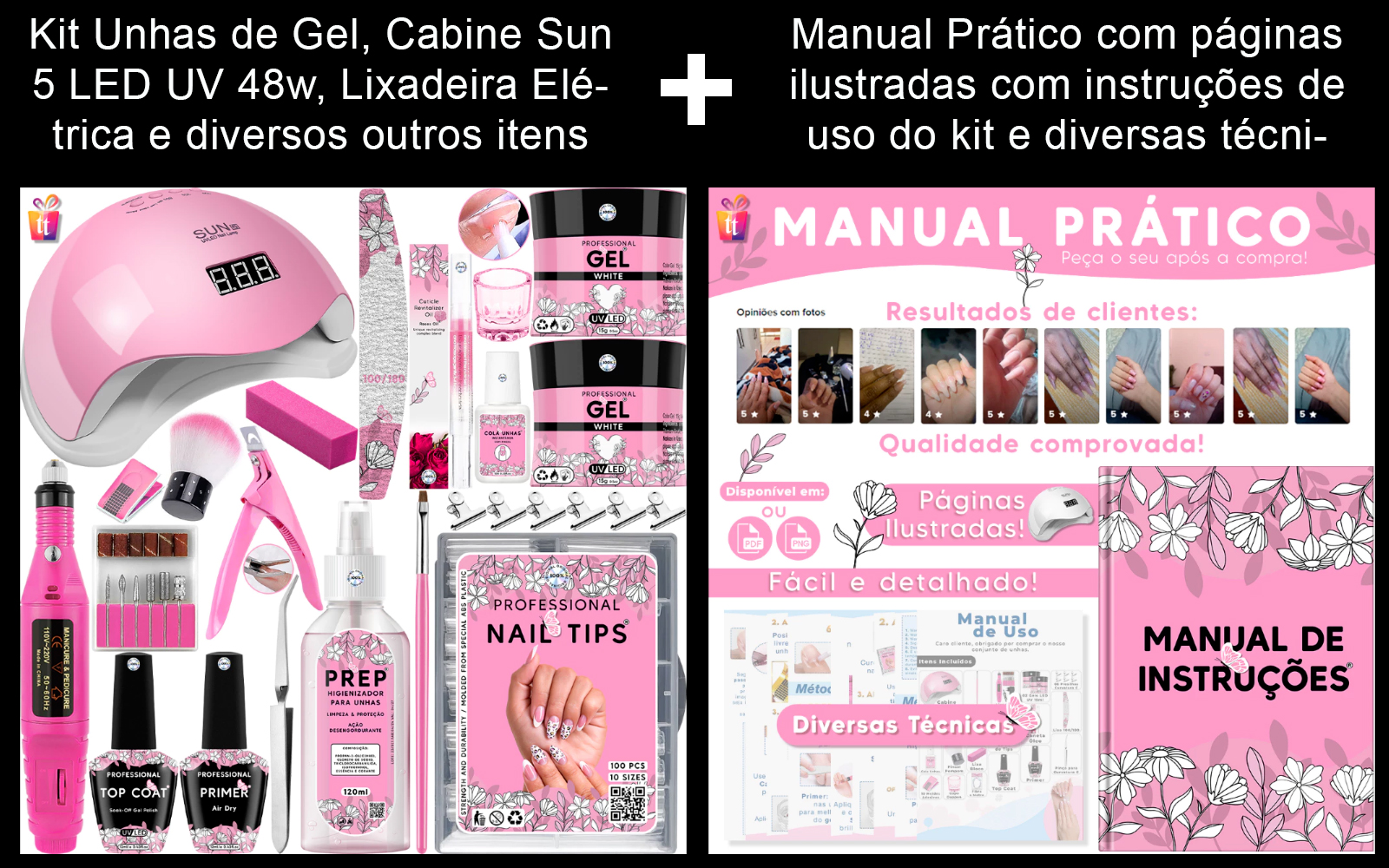 Inclui alongamento em fibra de vidro, unhas em gel moldado e gel com tips, ponto de tensão, curvatura em C slim, cristalização para unhas fracas, esmaltação em gel blindagem e Decorações fixas.